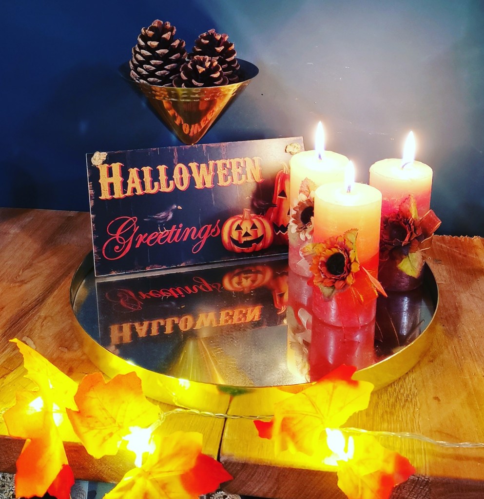 Candles – I’ve chosen some autumn smelling candles to set off the atmosphere that I’m trying to create. When I think of Halloween the scents of spiced pumpkin latte, toasted marshmallows, and toffee apples spring to mind. Also the burnt orange and pale brown colours associated with autumn and pumpkins. I found some autumn pillar candles hidden away in a drawer so I’ve dusted them off and put them back in use. I picked up these new ones from Home Bargains: