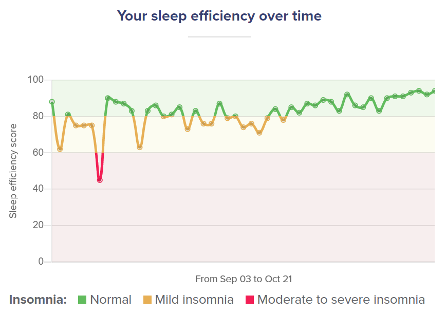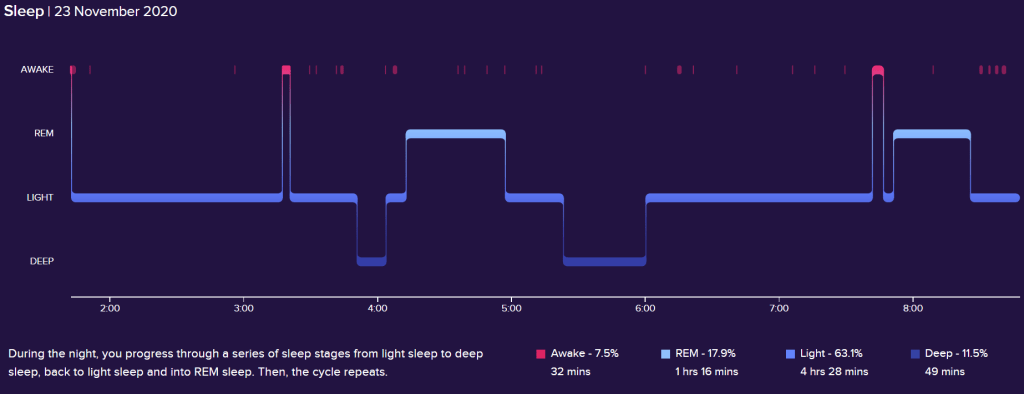 Then the following weeks was slowly building up the time in bed, trying out other techniques based on my diaries, and also continuous help from my sleep coach throughout the week.  You can see from my sleep report that my quality of sleep improved significantly in just 8 weeks, following the advice and techniques given to me. It is now over a year later and I can say my sleep is still amazing (see my Fitbit chart below from Nov ‘20)
